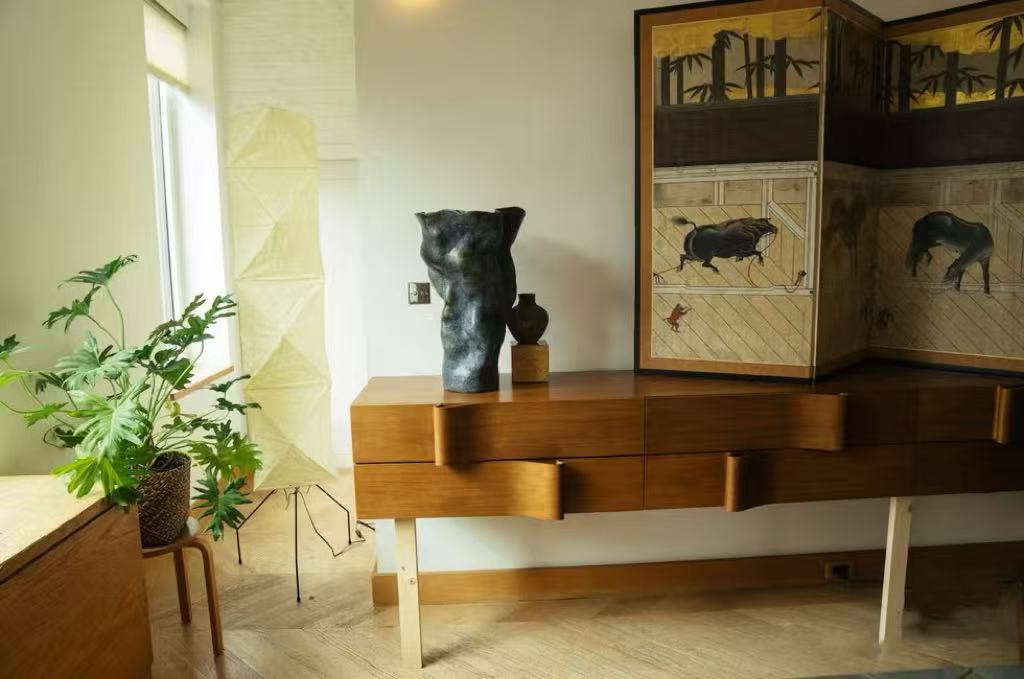 如果你覺得中古家具看多了有點膩,那這里的掛畫、燈具與柜體布置,絕對是點睛之筆。餐廚區用藝術屏風、小型雕塑點綴,普通空間秒變畫廊。餐桌上的食物擺盤、咖啡杯,把日常過成電影橋段。餐廳的吊燈并未按常規高度安裝——是為了不破壞背景墻的整體感。開放式書架擺滿書籍與小物,下方設置卡座沙發,將閱讀與休憩融為一體,隨手一拍就是“知識分子風”氛圍。而整個空間中最大膽的一筆,是那一抹灰藍色——在溫潤的木色中成為“搭配神色”,客廳藍色地毯與書柜的藍色沙發,沉穩中打破沉悶,中和冷暖調。